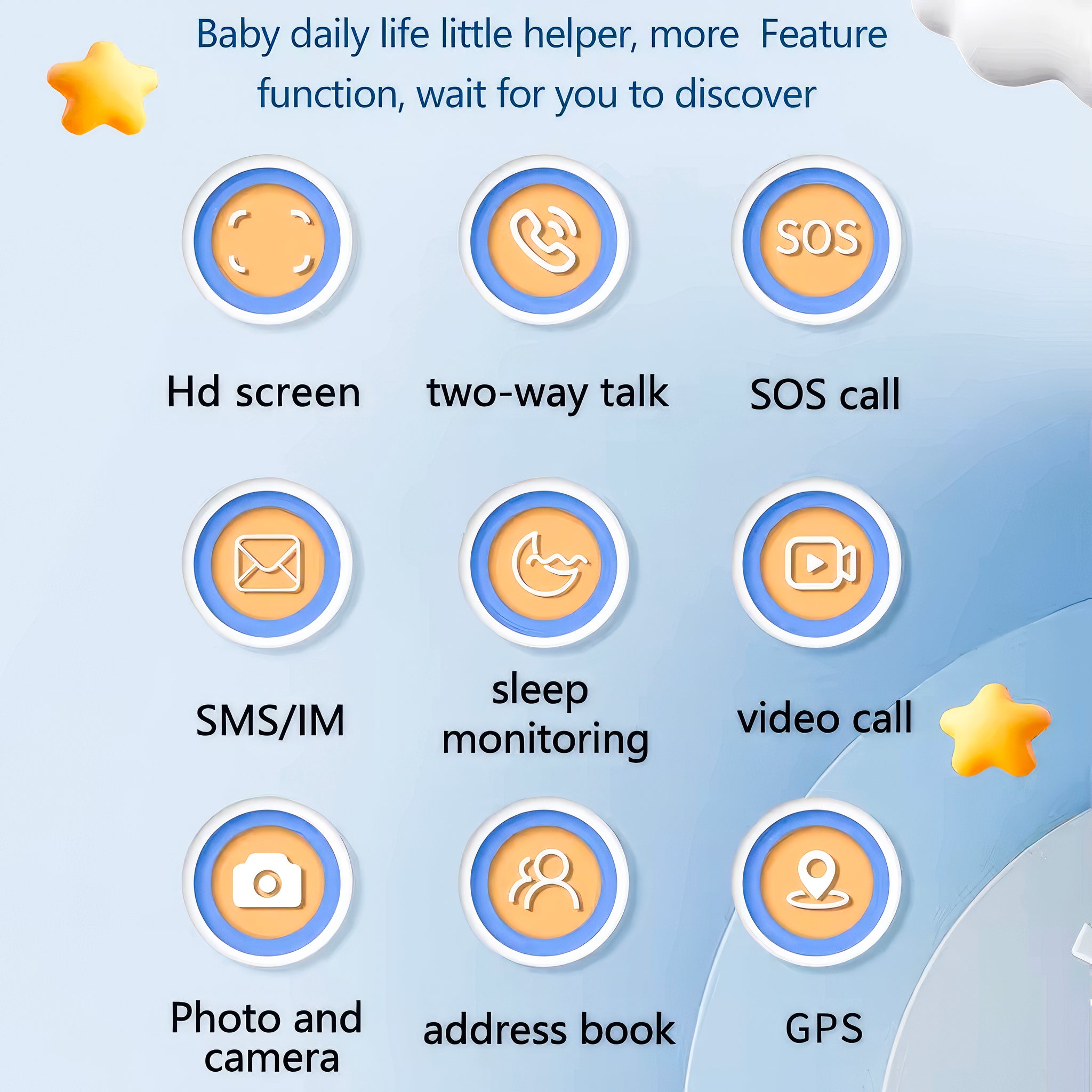 Parental control, Dial, 2 way calls, SOS, Phone book, Flash Light , Voice Chat, Anti-lost, Alarm, Math Game, LBS+AGPS Location, IP67 Waterproof.