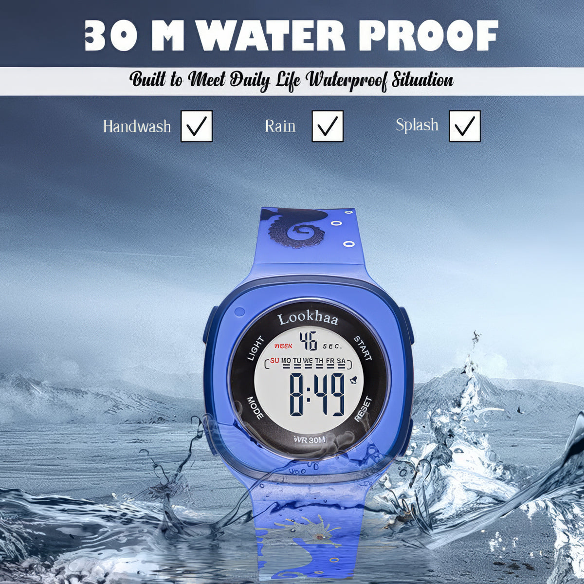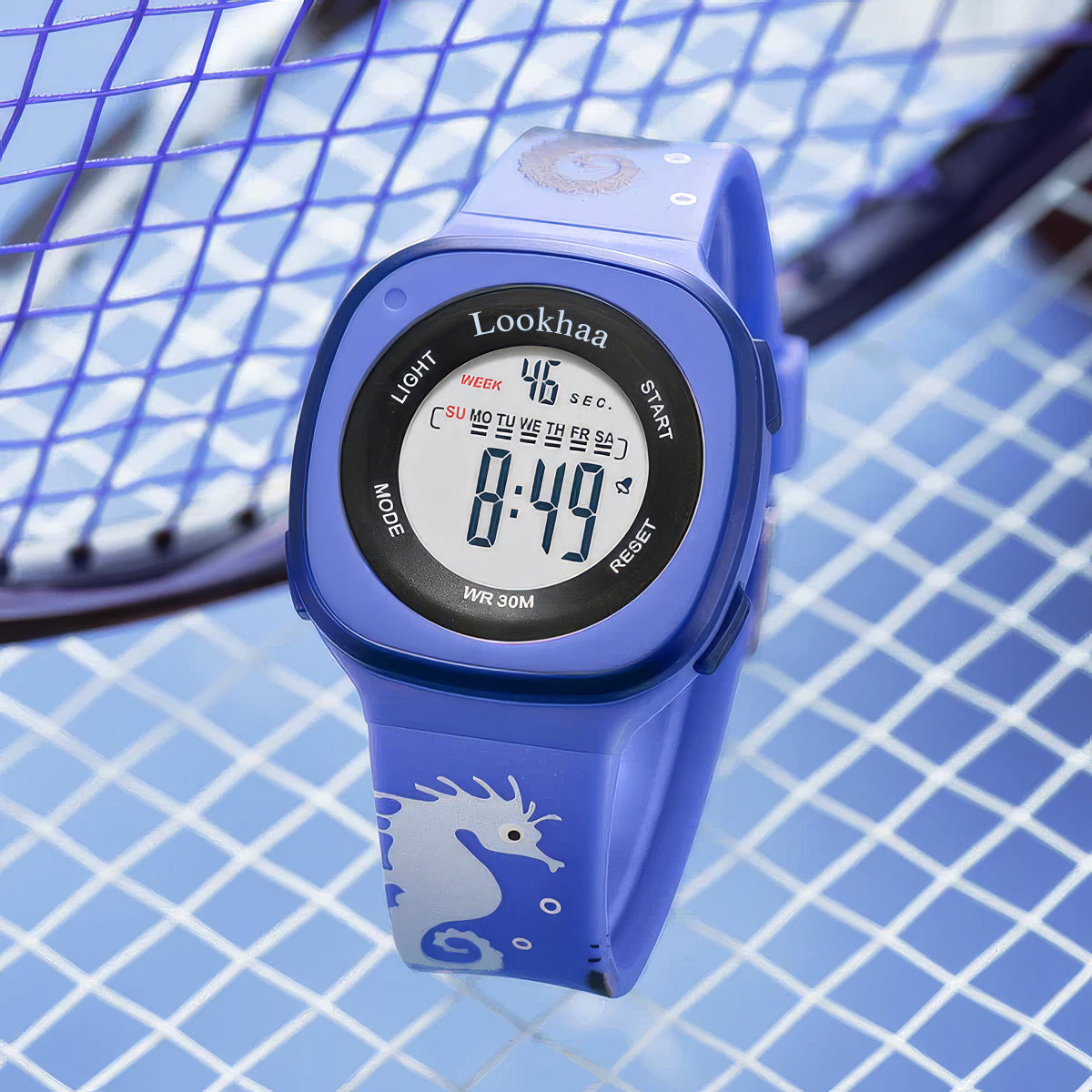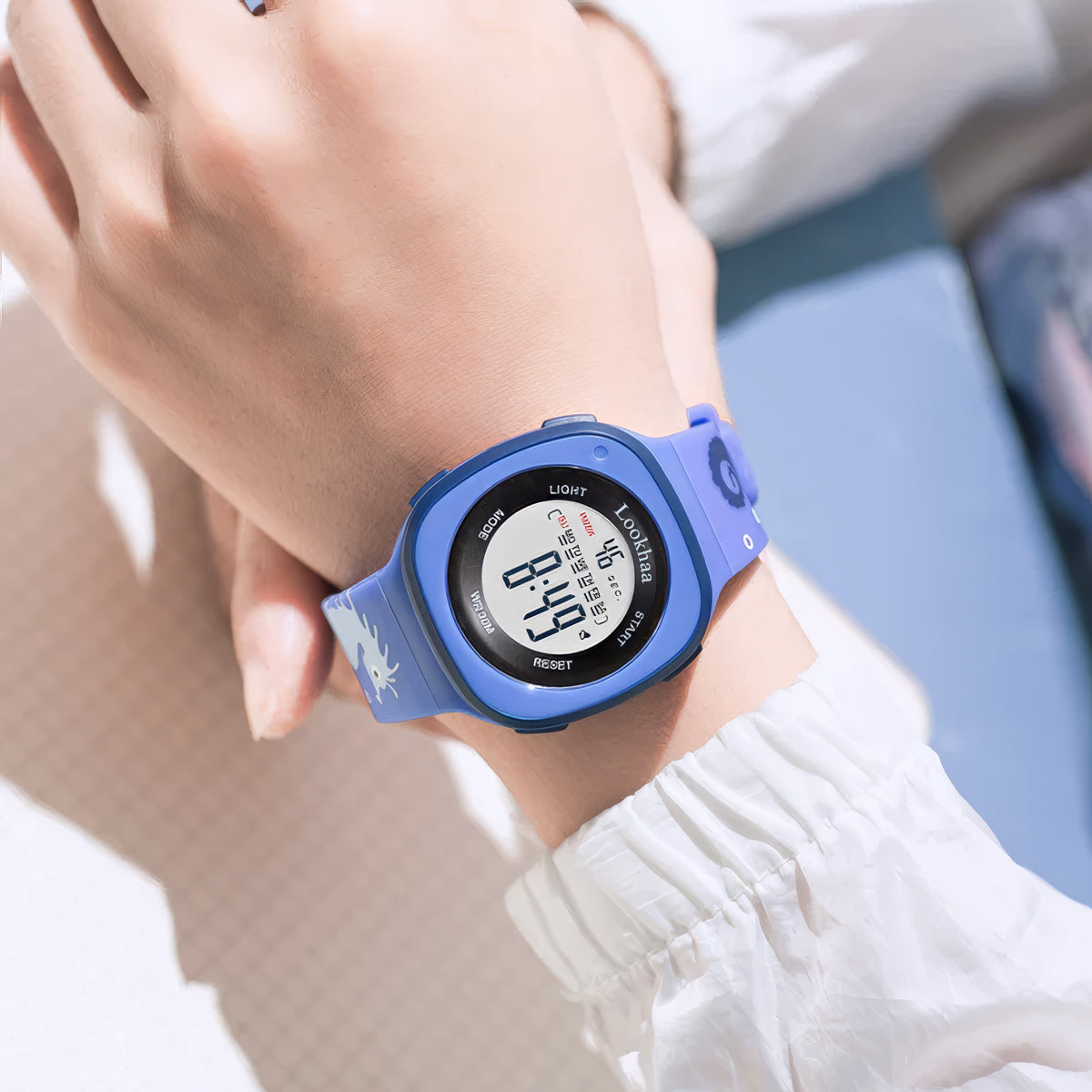 The Lookhaa Multifunctional Kids Digital Wrist Watch is a unique and stylish timepiece designed for boys and girls aged 3-14. It features a round face with a black and blue color, creating a playful accessory. The standout LED luminous light display allows for easy time reading in low light conditions, perfect for kids checking the time at night. This watch is multifunctional, catering to active kids with an alarm function for setting reminders and a stopwatch for timing sports activities. The silicone strap provides comfort and durability, making it suitable for active use.